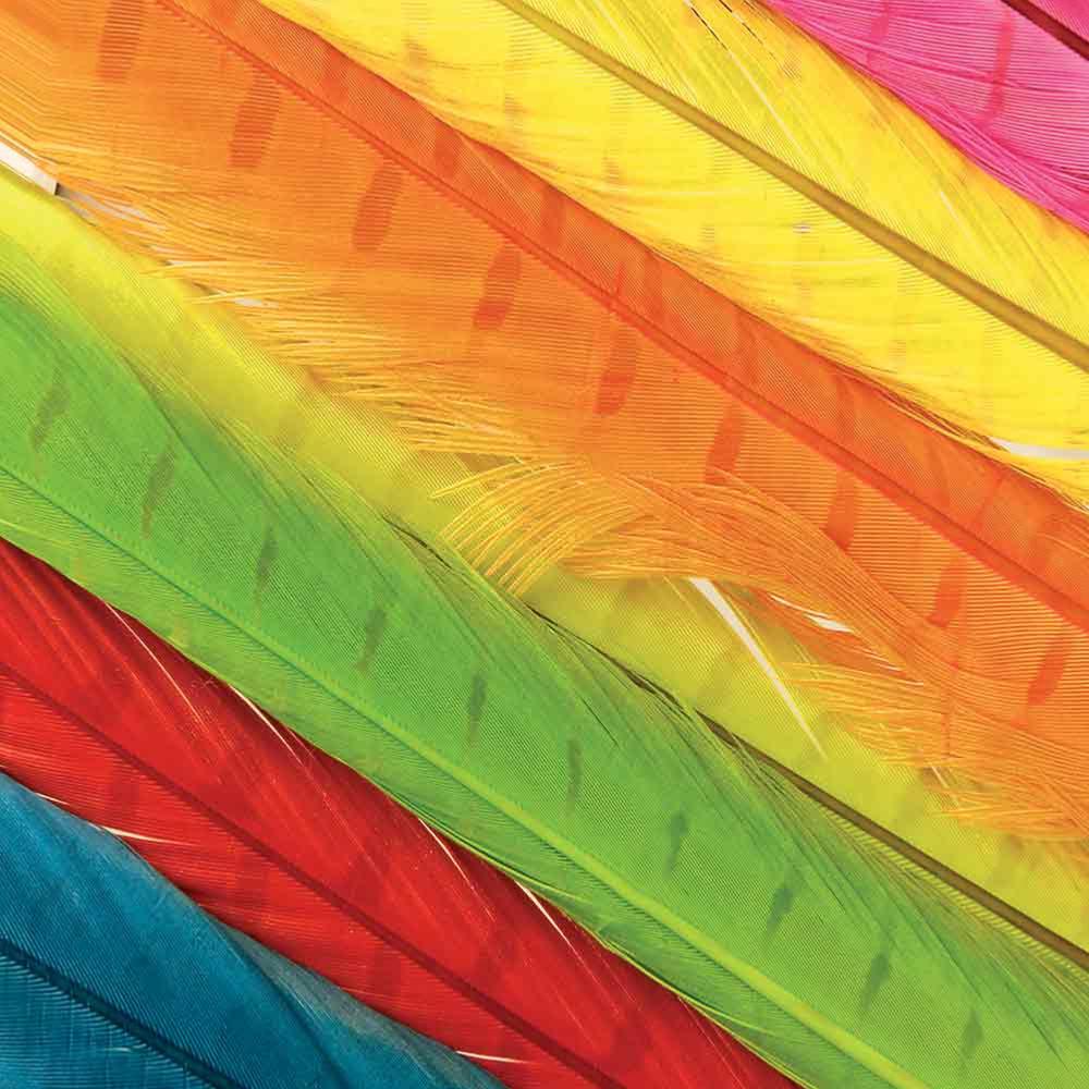Cock Pheasant Colour Extracted & Dyed Centre Tail piece Mixed Packet - The subtle chemical processing of these tails has rendered a superb quality feather for use as bodies and wings on a wide range of patterns. The essential fibrous quality of the original feather has been retained throughout the process. A mixed packet of 6 pieces of bleached and dyed Cock Pheasant tail in popular colours.