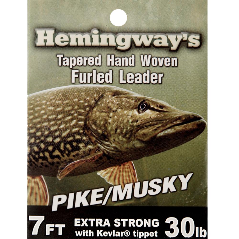Hemingway Pike / Musky Furled Leader, an extra strong, abrasion resistance leader with Kevlar tip section for toothy fish.Material premium quality nylon. Kevlar Line weight 9 -12 wt. Length 7 ft. Tippet 30 lb.
