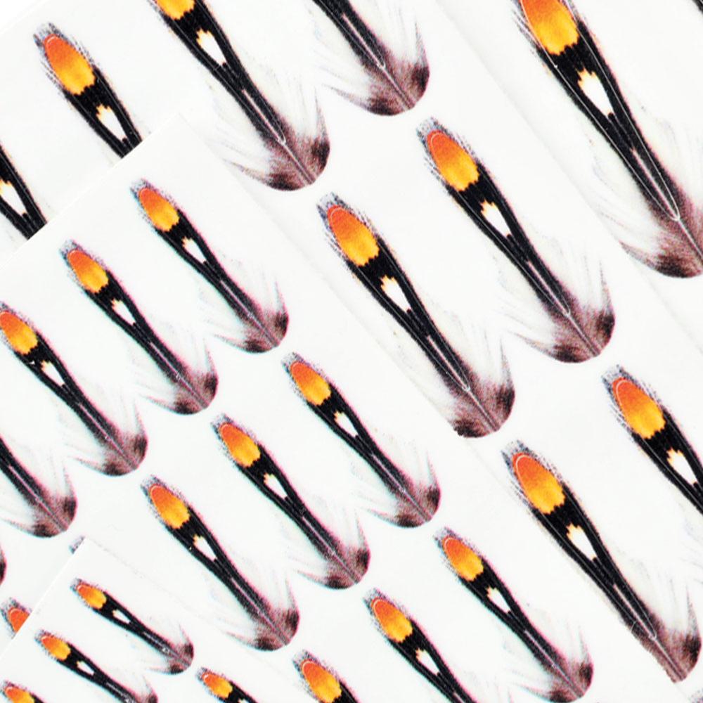 Jungle Cock Synthetic subs from Veniard, a Jungle Cock 'Feather Shape' printed onto ultra-thin plastic vinyl sheet which can be peeled off as required - Very realistic and easy to use. Jungle Cock subs, available in four sizes, extra small 10mm - 20 feathers; small 15mm - 20 feathers; medium 20mm - 16 feathers and large 25mm - 16 feathers.