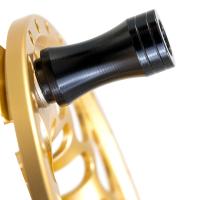 The Snowbee Prestige Gold Fly Reel is finished in a beautiful, understated satin gold colour, giving these quality reels a classy look. The hard gold anodised finish provides superb saltwater and chip resistance. The comfortable spool handle and counter weight are machined from aluminium and hard anodised in a contrasting black colour. The counter-weight (see pictures) features another Snowbee innovation – a machined groove, tightly fitted with two small rubber O-rings. This allows you to slide your tippet down between them to hold it securely, while you are walking to the boat or bank. The quick release spool and simple left to right hand conversion, ensures the Prestige Gold reels will provide a long, untroubled fishing life.