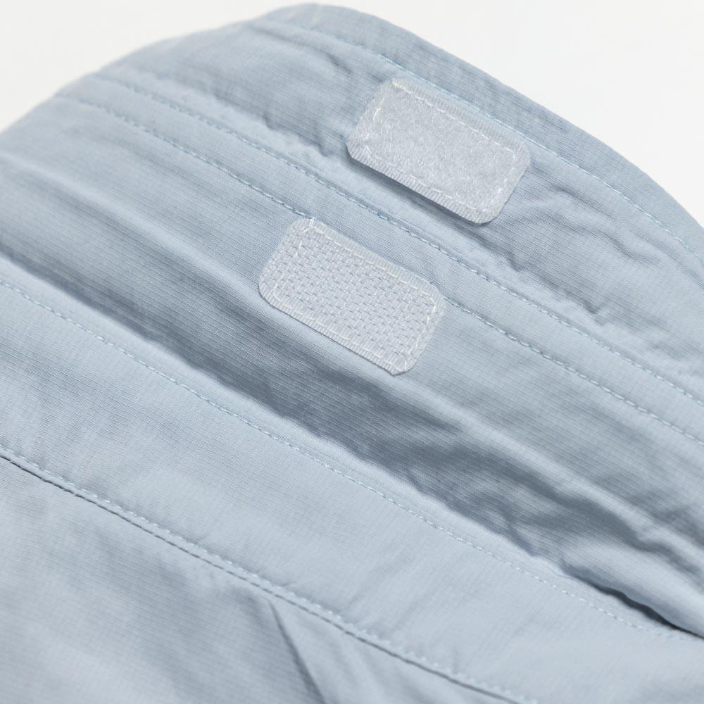 • Button-down collar with a hidden Velcro tab and fold-up panel to shield the back of your neck from intense UV rays.