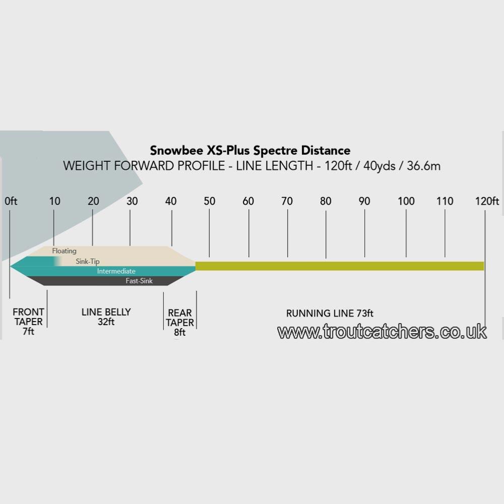 The new Snowbee XS-Plus Spectre line design allows for the casting ability of most fly anglers. If you can cast at all, this line will flatter your performance. If you can cast well, the Spectre lines will help make your casting become exceptional. The new Spectre series have a new profile, extending the range of Snowbee traditional XS fly lines and are all 30ft longer in total length to account for their outstanding performance. Each of the new Spectre Distance lines have the same 47ft length head, but to help achieve the benefit of longer casts with much the same casting ability, the profiles have been ‘tweaked’ to optimise performance, with all casting abilities. The 7ft front taper allows good turnover at longer range, while the 8ft rear taper provides a range over which a good cast can still be achieved, whether the optimum head length has been precisely aerialised, or not.