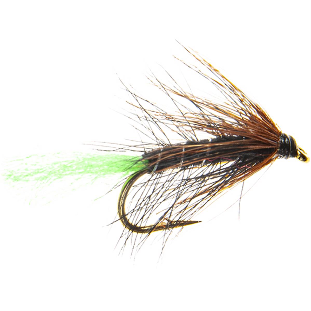 The Green Tail Kate Mcclaren is a classic wet hackled trout fly, renowned for its effectiveness in UK waters. Originating in Scotland, this fly is a variant of the traditional Kate Mcclaren, distinguished by its vibrant green tail. Its design features a bushy black hackle, a peacock herl body, and a striking red head, making it irresistible to trout. The fly's movement mimics natural prey, enticing even the most cautious fish.