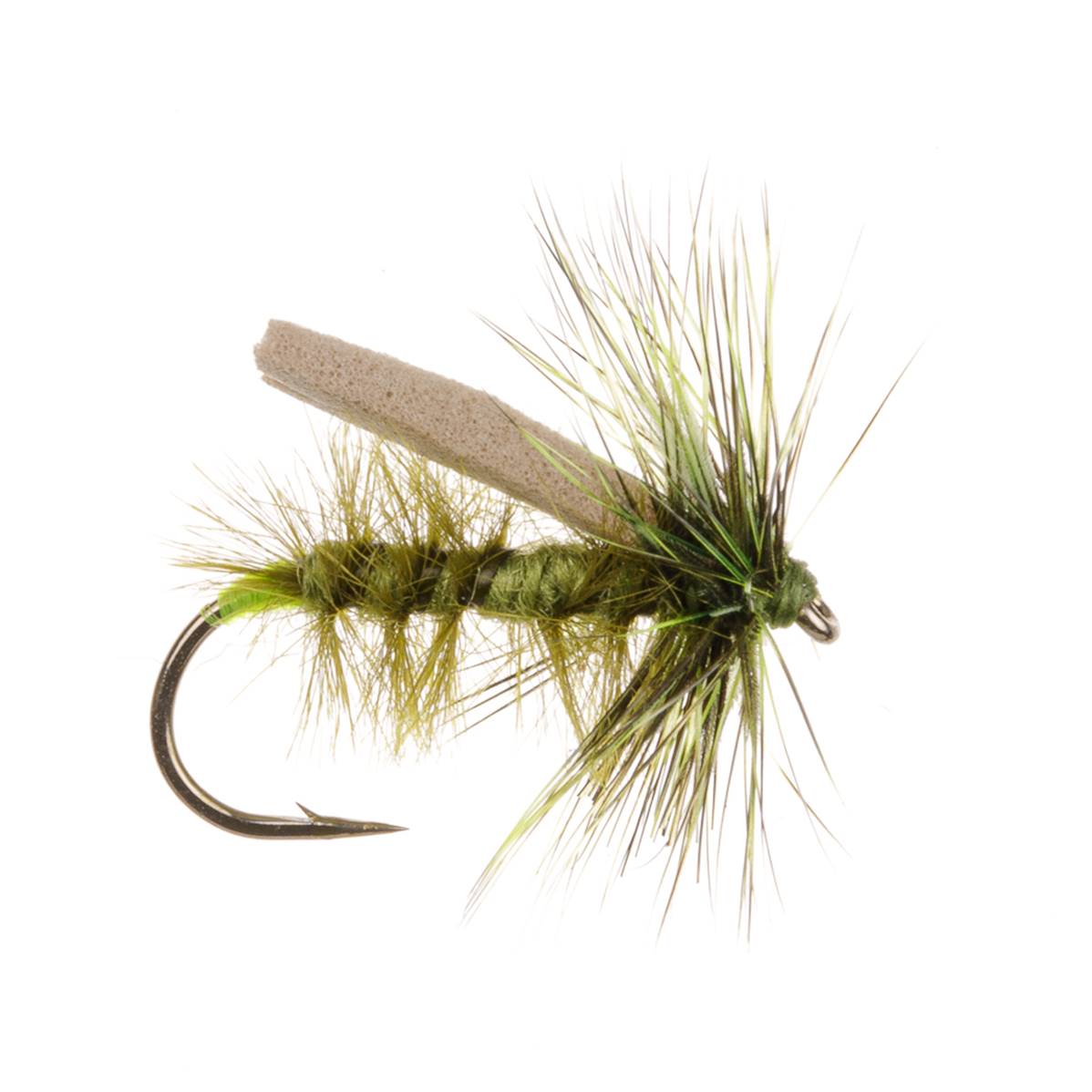 The Olive Foam Caddis fly imitates the adult stage of the caddisfly, a crucial part of a trout's diet. As caddisflies emerge from their pupal stage, they become vulnerable on the water's surface, making them an easy target for trout. The foam body of the fly mimics the buoyant nature of the adult caddis, while its olive colour matches the natural hues of the insect.