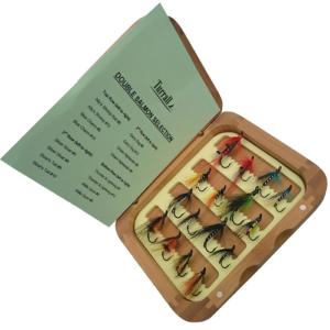 Turralls presentation Salmon Double fly selection of 16 flies is a series of fishing flies presented in Turralls handsome bamboo pocket sized fly box crafted from mellowed split cane. The fly box has slotted foam inserts which will securely hold trout and salmon flies. Brass hinged with magnetic closure this beautiful box is lightweight and floats - almost too nice to take fishingEach Salmon Double fly is carefully selected from the award winning range of Turrall flies which will offer a balanced choice of essential flies to match seasonal hatches and regional requirements.Picture for illustration only.