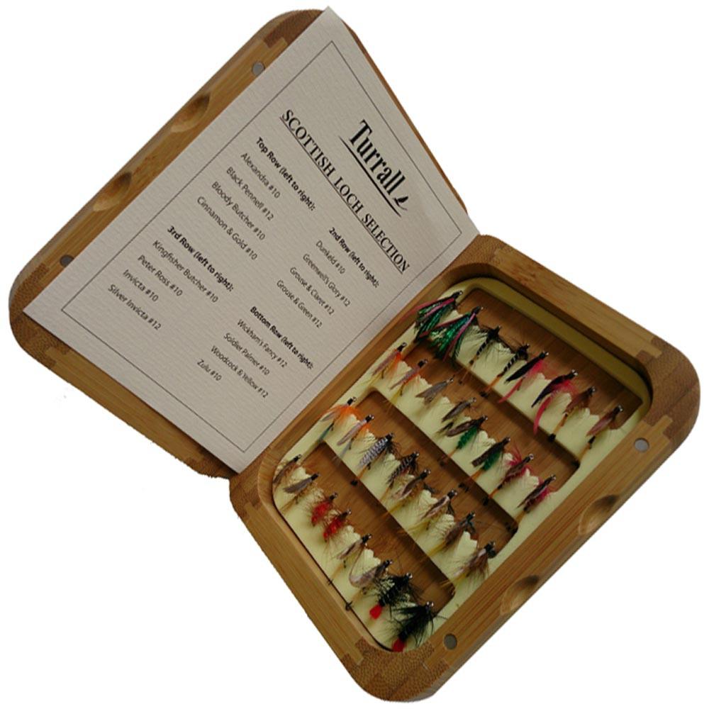 Turralls presentation Scottish Loch fly selection of 32 flies is a series of fishing flies presented in Turralls handsome bamboo pocket sized fly box crafted from mellowed split cane. The fly box has slotted foam inserts which will securely hold trout and salmon flies. Brass hinged with magnetic closure this beautiful box is lightweight and floats - almost too nice to take fishingEach Scottish Loch fly is carefully selected from the award winning range of Turrall flies which will offer a balanced choice of essential flies to match seasonal hatches and regional requirements.Picture for illustration only.