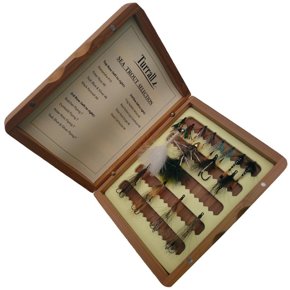 Turralls presentation Sea Trout fly selection of 16 flies is a series of fishing flies presented in Turralls handsome bamboo pocket sized fly box crafted from mellowed split cane. The fly box has slotted foam inserts which will securely hold trout and salmon flies. Brass hinged with magnetic closure this beautiful box is lightweight and floats - almost too nice to take fishingEach Sea Trout fly is carefully selected from the award winning range of Turrall flies which will offer a balanced choice of essential flies to match seasonal hatches and regional requirements.Picture for illustration only.