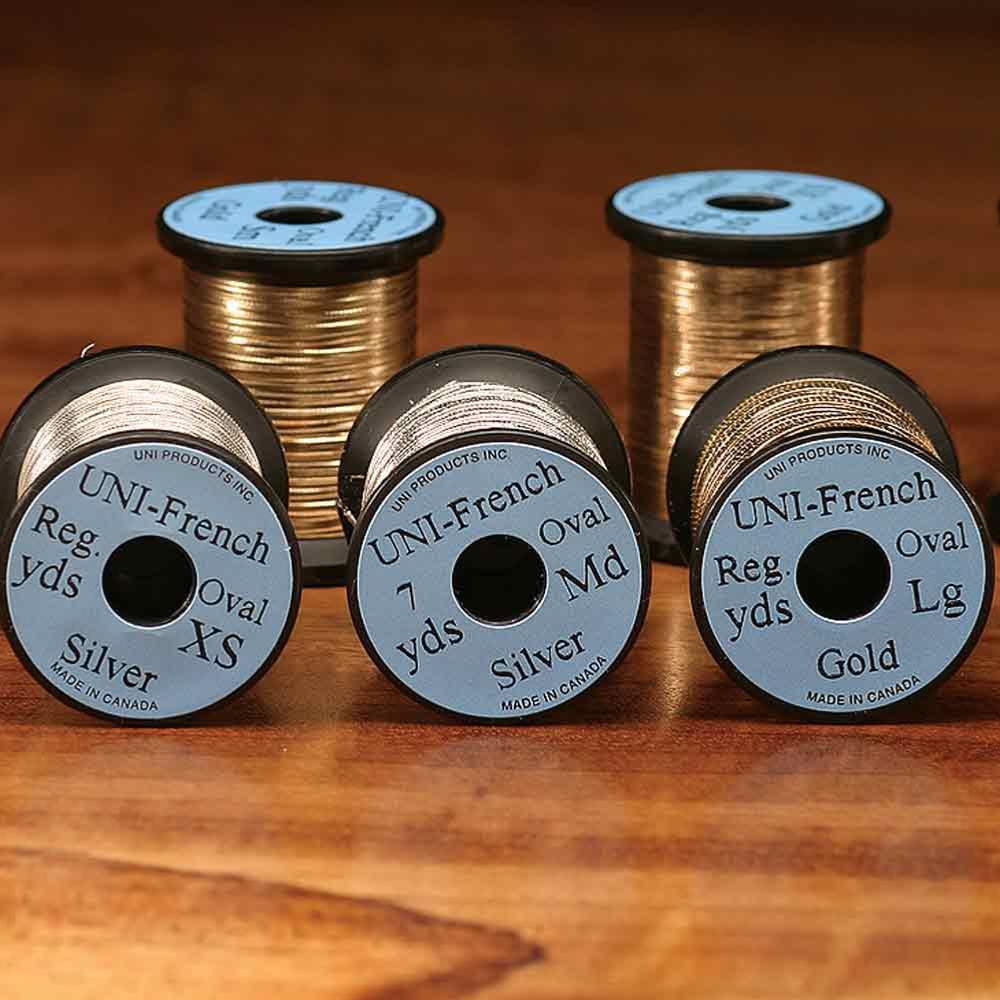 UNI French Oval Tinsel available in Gold or Silver with a choice of 4 sizes; Extra-Small (30 yard spool - #14), Small (20 yard spool - #15), Medium (7 yard spool - #16) and Large (5 yard spool - #18).