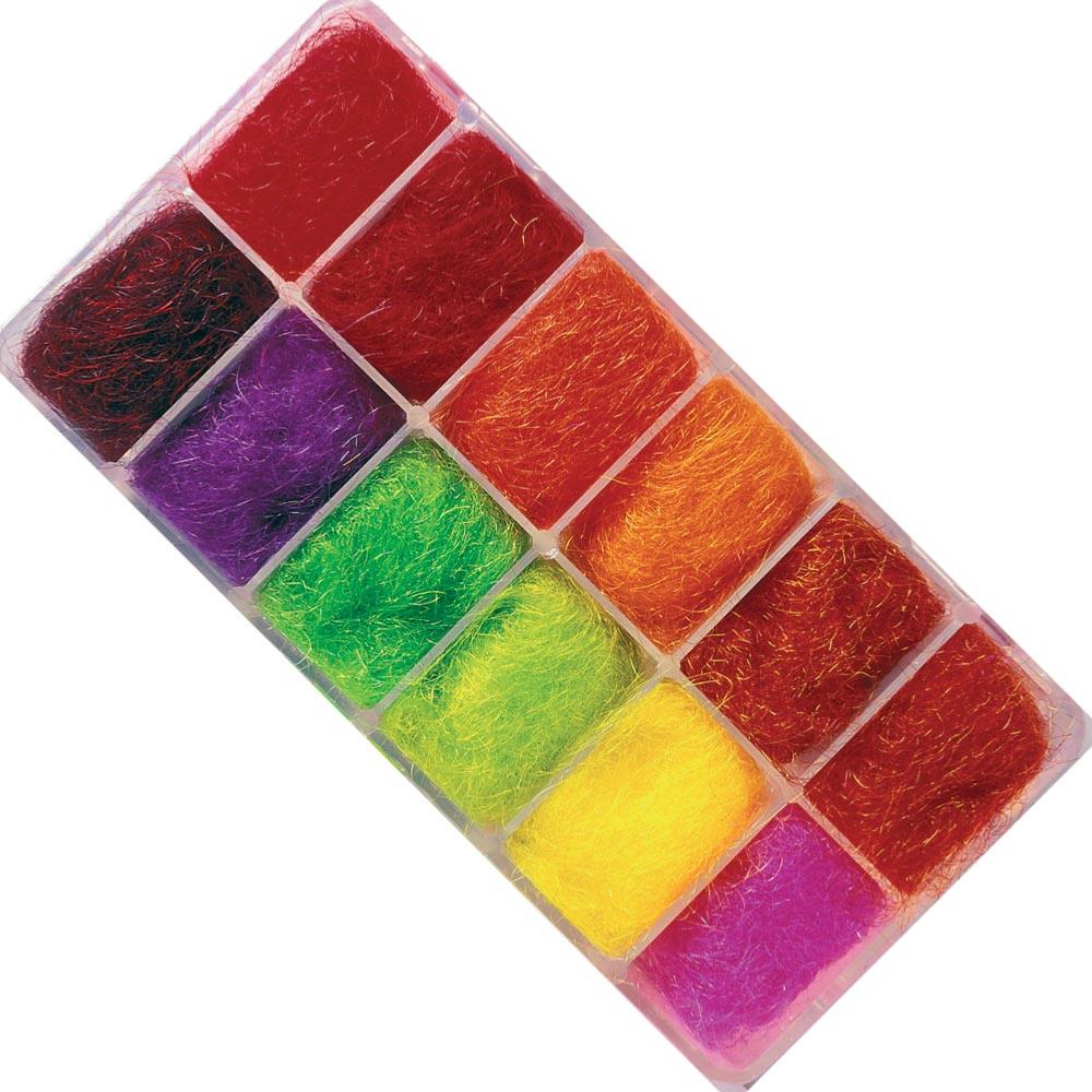 Veniard SLF 2 Dispenser - A mix of 12 of the brighter more vibrant Synthetic living fibre (SLF) colours, very popular with fly tyers due to its translucence and sparkle.